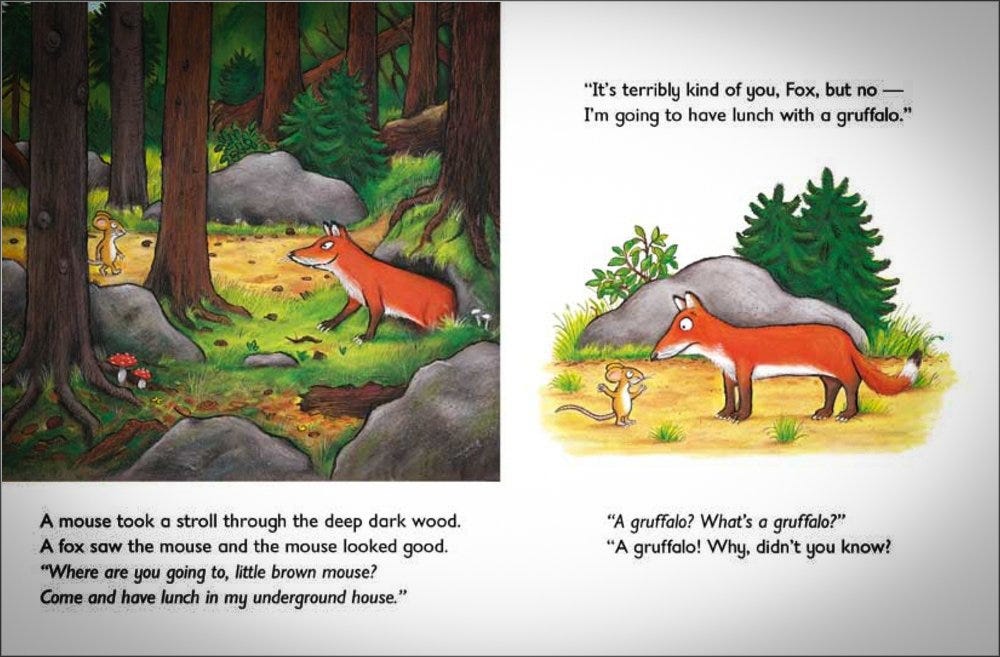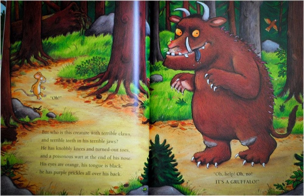 In the story, a mouse goes for a stroll through the deep dark wood to find a nut, and he comes upon some difficult obstacles that stand in his way. In order to keep going, the mouse ‘makes up’ something called a Gruffalo.