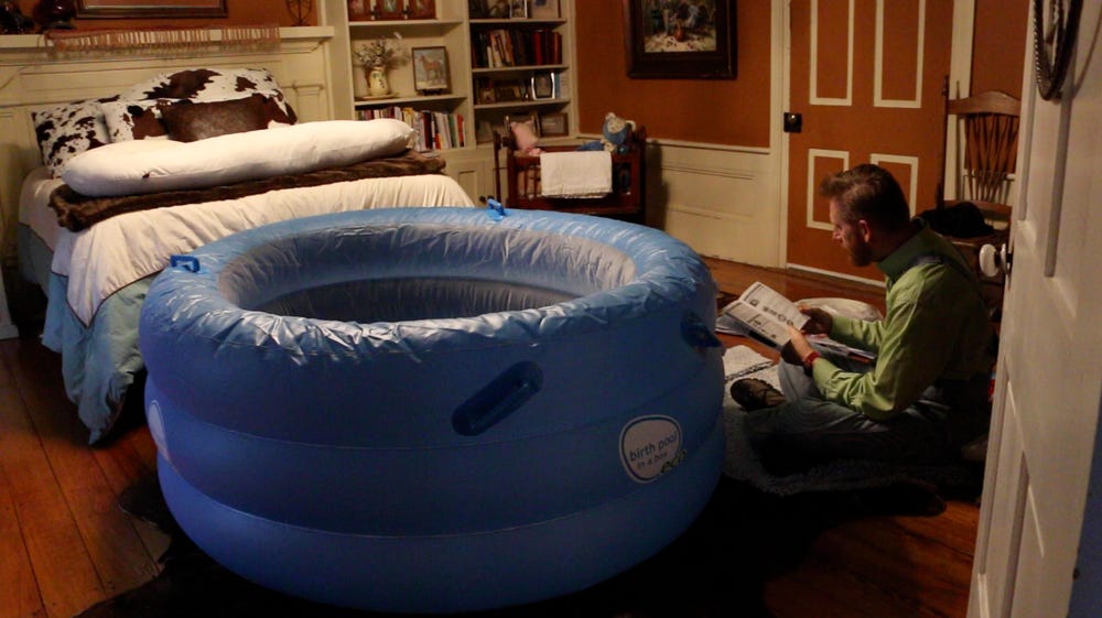 I had never even heard of a birthing tub, but with Joey’s discovery of midwives and home birth, I’ve learned lots of new things. So I sat down with manual and started blowing it up. We’re not supposed to add the water until the big day arrives (let’s hope we have time then…our hot water heater and our well aren’t very big). I know that this was made to have a baby in, or spend some of the tough part of your labor in… but I’m thinking it would make a great hot tub til then.