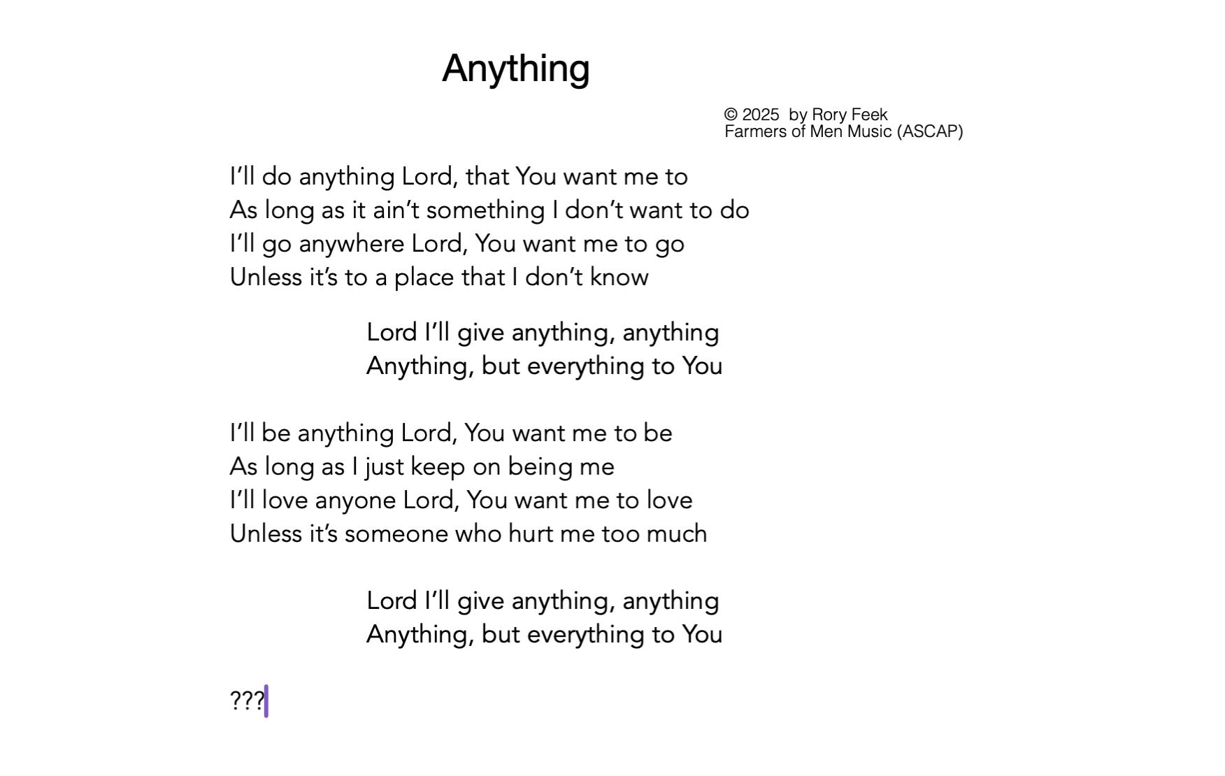 But the very first new song, and the first thought and line that He put in my heart was this one. “I’ll do anything Lord that you want me to”. I thought the song was going to be about how much my faith has grown, but by the second line, I realized it was just the opposite. He was revealing something to me that I was unable, or more likely, unwilling to see in my walk with Him.