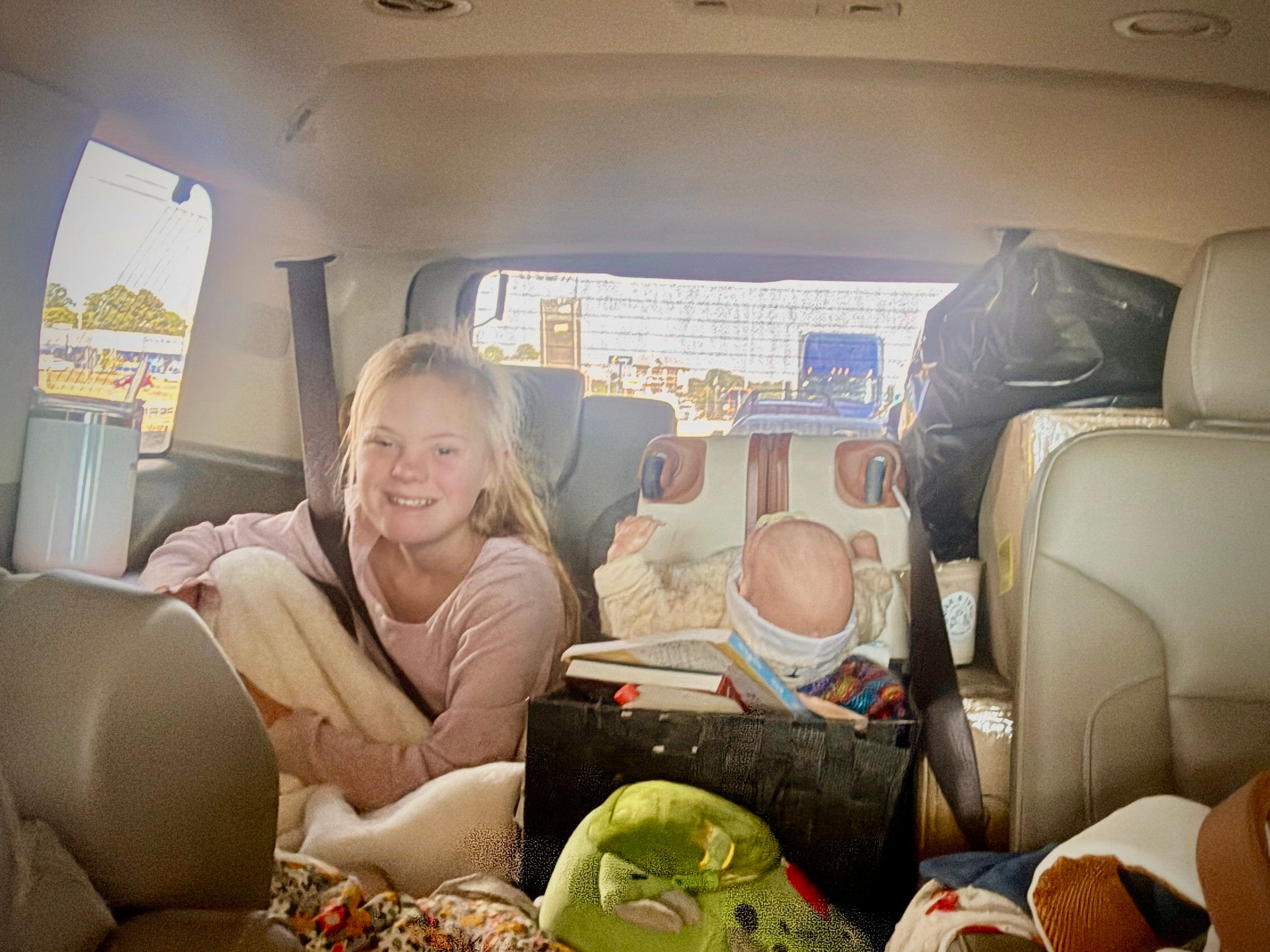 Indy’s always been a wonderful traveler. Happy as can be in her spot in back, reading or drawing. Or singing. Or these days working on making potholders with her loom, asking from time-to-time, “how long til we get there?”. And whether it’s 10 minutes or 10 hours, the answer’s pretty much then same.